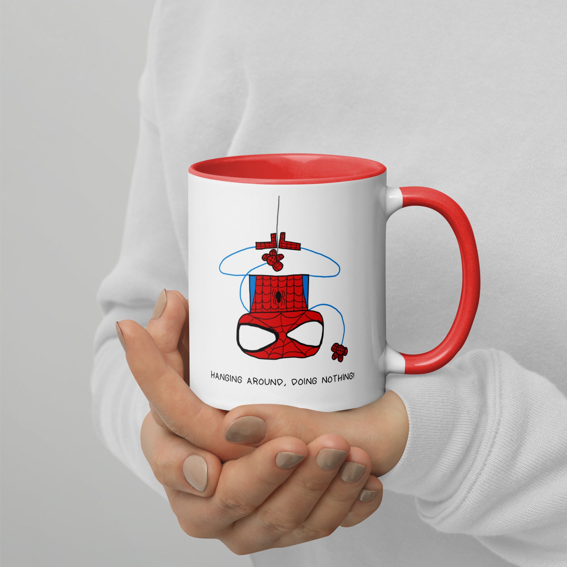 This 11oz mug features a suspiciously familiar spider-themed hero who is definitely not trademarked, suspended above the words: "Hanging around, doing nothing!" Relatable? Absolutely.